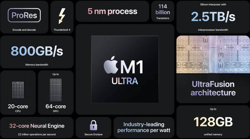 Что касается аппаратной начинки, то максимальная комплектация предусматривает SSD объёмом 8 ТБ, 128 ГБ ОЗУ и новейший процессор Apple M1 Ultra. По сути, это два M1 Max, объединённых в одном чипе. При этом по производительности 20-ядерный Ultra превосходит M1 в восемь раз. Будет Mac Studio и в версии с процессором M1 Max, а за самый навороченный вариант Apple просит 8000 долларов.