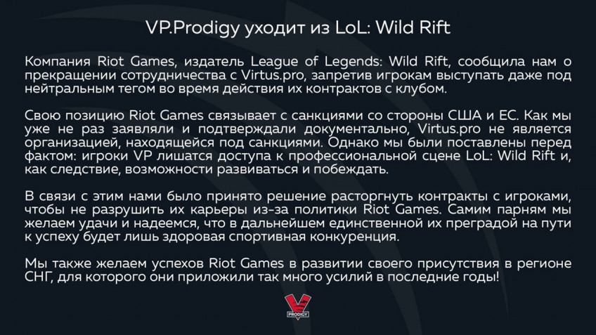 Российская организация Virtus.pro распустила состав по League of Legends: Wild Rift. В социальных сетях клуба появилось заявление, в котором сказано, что Riot Games прекратила сотрудничество с клубом.