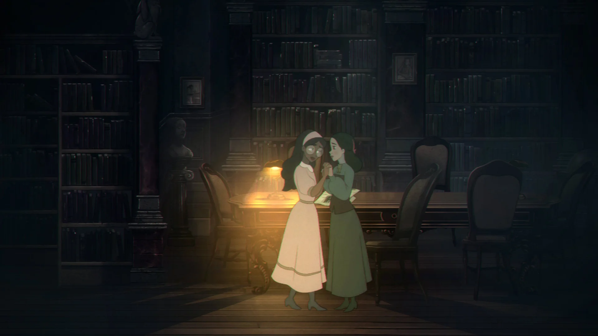 С последним помогает визуальный стиль. Вкратце — он чудесный. Подробно — рисованная графика действительно творит чудеса на экране, мгновенно вызывая приятную ностальгию по золотому веку диснеевской анимации. Каждая локация выглядит и воспринимается как вырезанный кадр из классических мультфильмов: герои сплошь большеглазые и выразительные, старинный особняк утопает в деталях викторианского интерьера, а приглушённые тона и игра контрастов между ярким, цветущим садом Корролы и тёмными, готическими коридорами пансиона обманчиво погружают в сказочное настроение — чтобы скример, готовый в любой момент выскочить, пугал особенно сильно. Но со временем привыкаешь, и тревога не отпускает вплоть до финала.