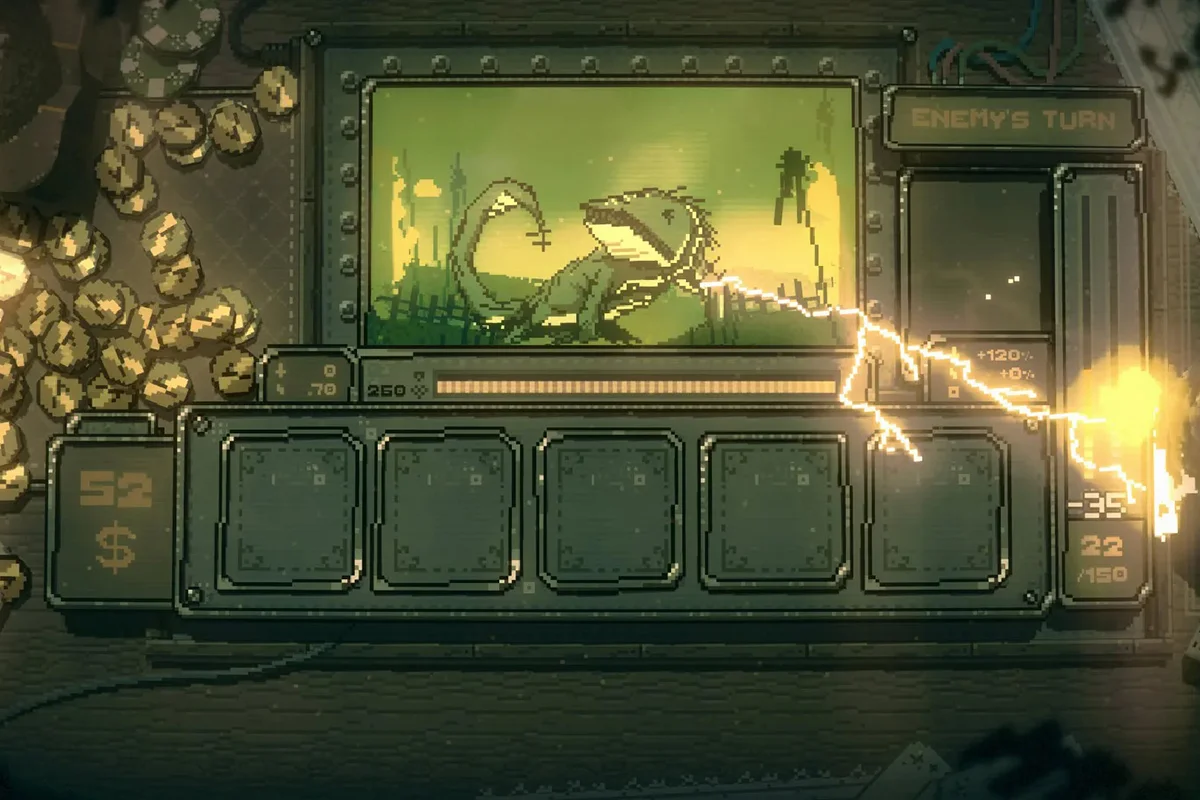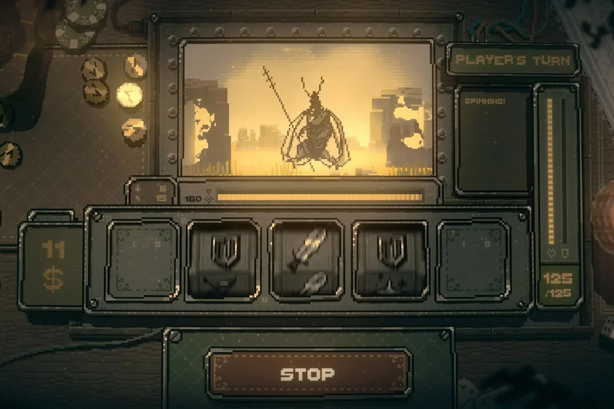 Игра встречает угрюмой пиксельной эстетикой с налётом старых DOS-RPG: ничего вычурного, всё предельно просто. Интерфейс минималистичен, цветовая палитра — строгая и выдержанная, а монстры выглядят как быстрые скетчи, набросанные в перерывах от безделья на полях блокнота. Но в этом — и обаяние. Простой пиксельный визуал не отвлекает, помогая полностью сосредоточиться на происходящем: на звуках крутящихся барабанов, на том, чтобы следить за комбинацией и вовремя прожимать кнопку в надежде выбить три подряд. От этого зависит, выживете вы в Slots & Daggers или нет.